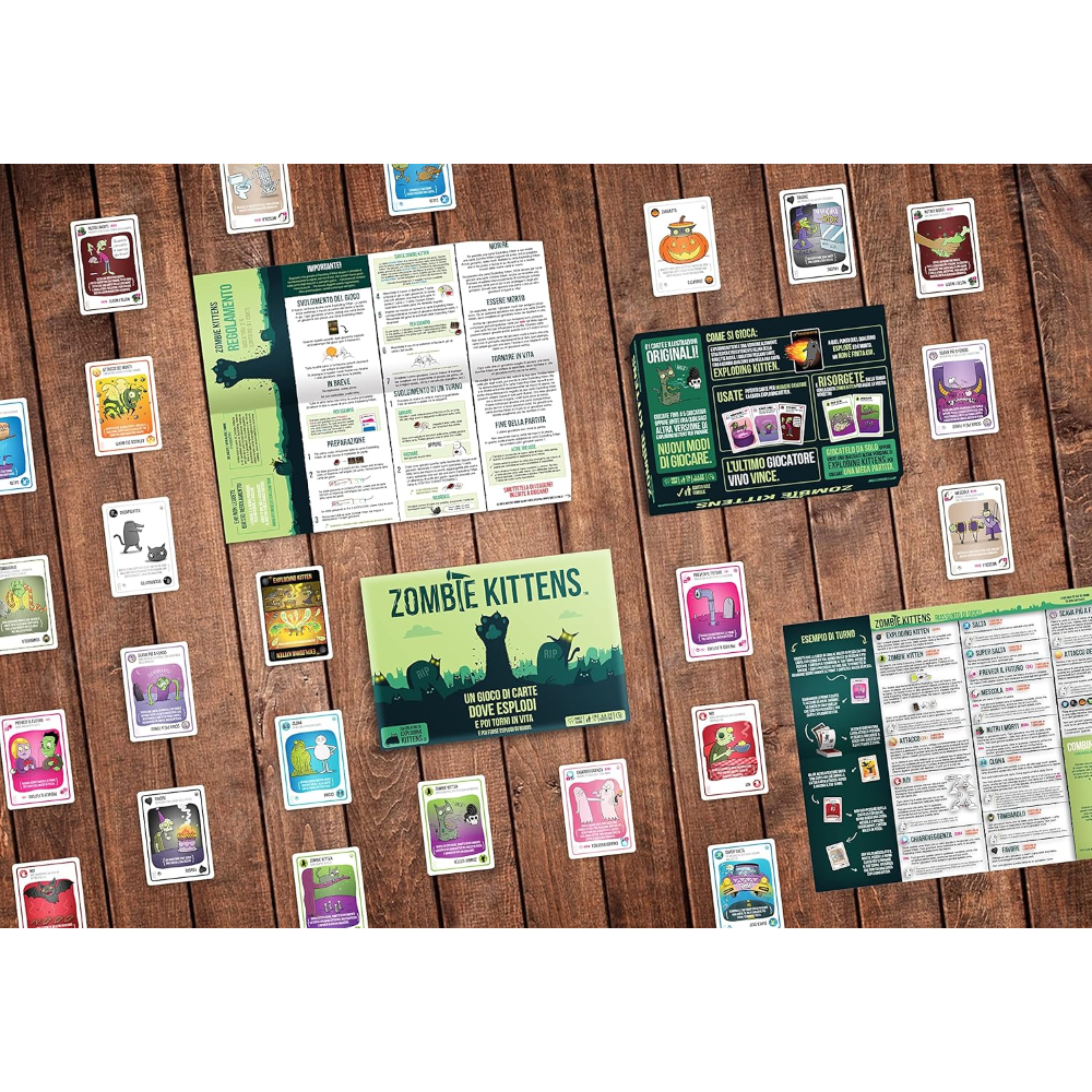 Usate potenti carte per muovere o evitare la carta Exploding Kittens e Risorgete dalla tomba con la carta Zombie Kitten per avere la vostra vendetta! L’ultimo giocatore vivo vince!