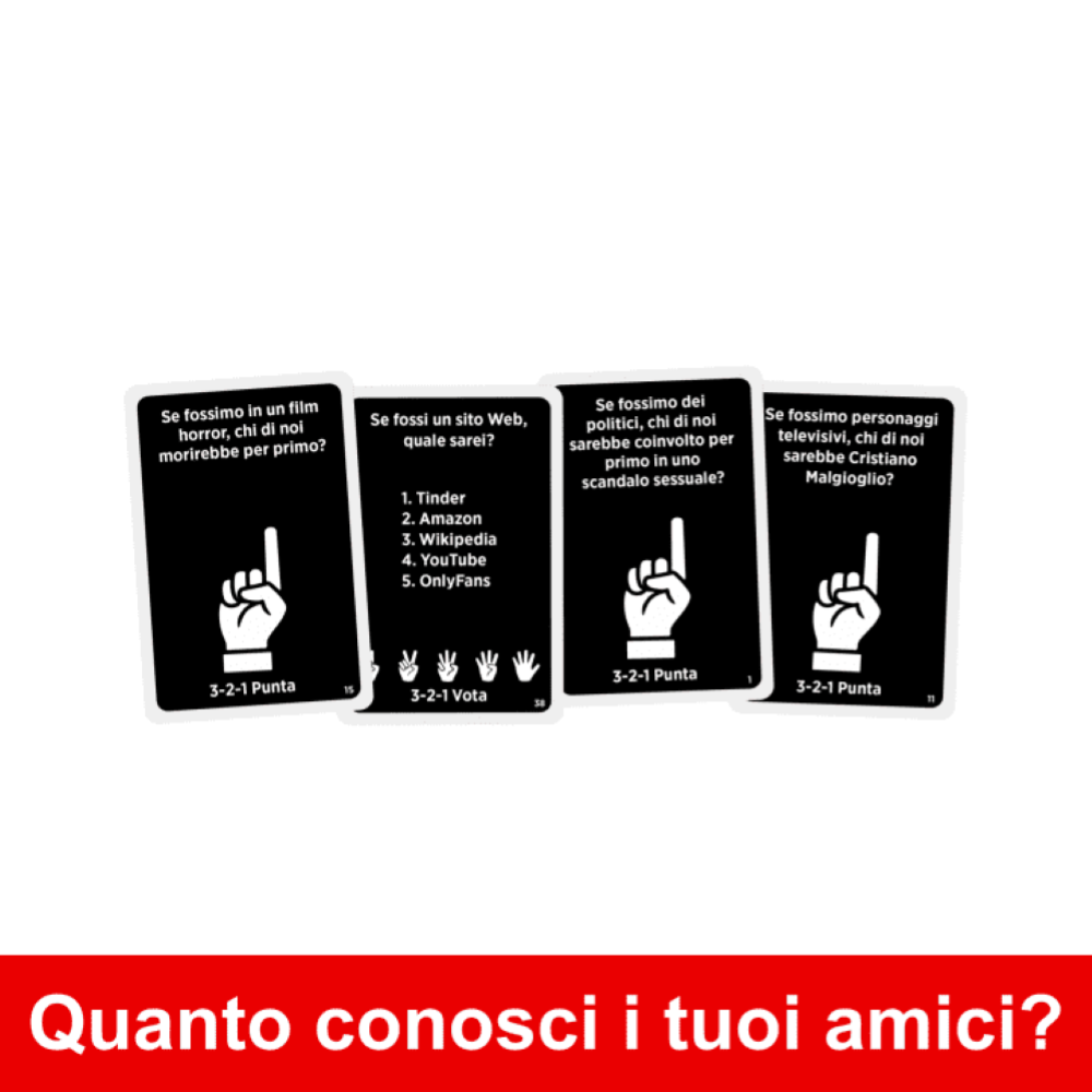 Ci sono due tipi di carte: a scelta multipla, in cui i giocatori votano con le dita (da 1 a 5), e a singola domanda, in cui le dita sono puntate sugli altri giocatori.