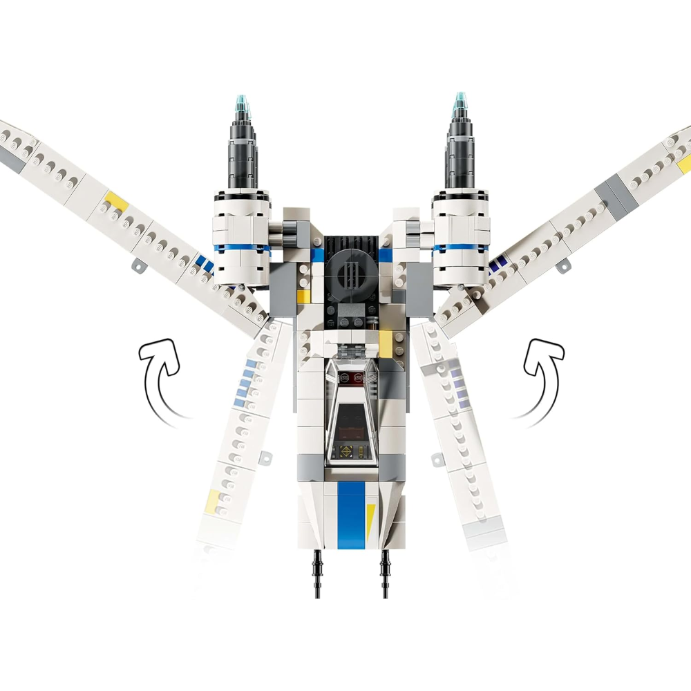 Veicolo giocattolo per bambini ricco di dettagli: il modellino Star Wars costruibile, dai colori bianco e blu, è dotato di una funzione swing-wing per regolare le ali dalla modalità atterraggio alla formazione a "V", adatta per il volo