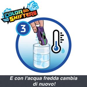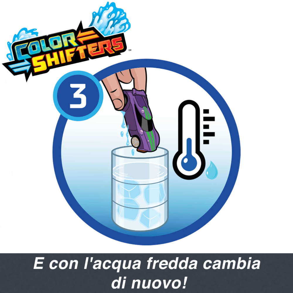 Le sorprese non finiscono certo qui grazie a un ulteriore cambio di colore! È sufficiente immergere la macchinina Hot Wheels nell'acqua fredda per scoprire una decorazione e un design ancora diversi. Se poi la si immerge di nuovo nell'acqua calda, la macchinina torna al colore originario. Ripeti questa operazione più e più volte per passare da un look all'altro! Con le 2 auto incluse, è come avere 4 auto in 1!
