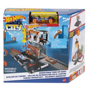 L'assortimento include un'auto officina, un drive-in che serve hamburger, un autolavaggio e un parcheggio multipiano da collegare tra loro e con altri set Hot Wheels. Ognuno in vendita separatamente.