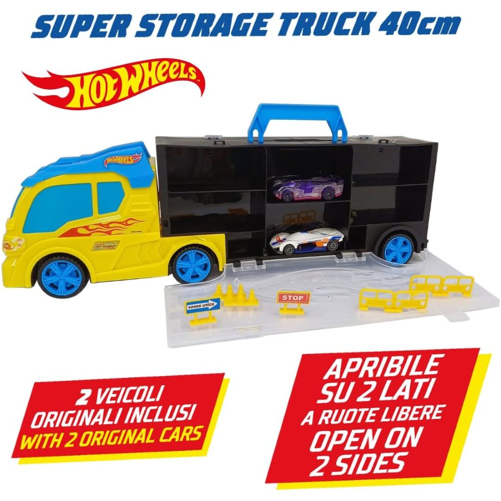 CONTENUTO DELLA CONFEZIONE: La confezione comprende un camion bisarca, 2 auto Hot Wheels a ruote libere, diversi segnali stradali e una maniglia per un facile trasporto. Un set completo per ore di gioco creativo.