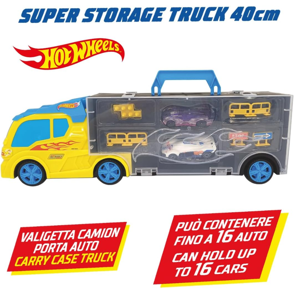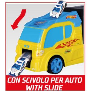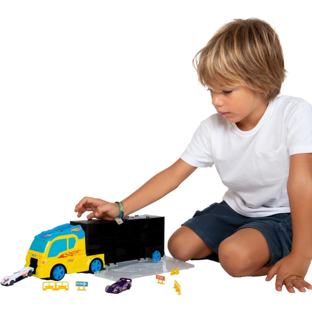 DIVERTIMENTO ASSICURATO: Il camion è dotato di uno scivolo frontale per giochi interattivi e include 2 auto Hot Wheels a ruote libere e diversi segnali stradali. La pratica maniglia lo rende facilmente trasportabile per un divertimento senza fine.