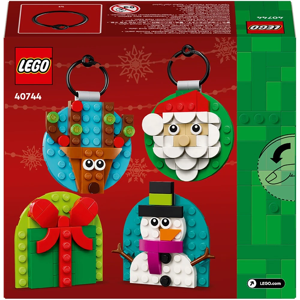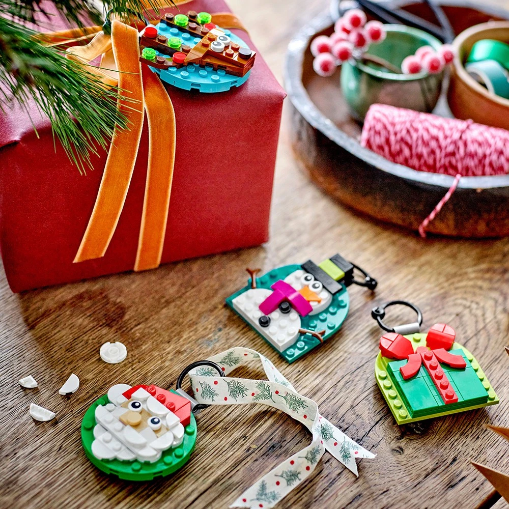 Set LEGO con molti motivi: crea 4 ciondoli colorati con diversi design: un regalo, un Babbo Natale, un pupazzo di neve e una renna
