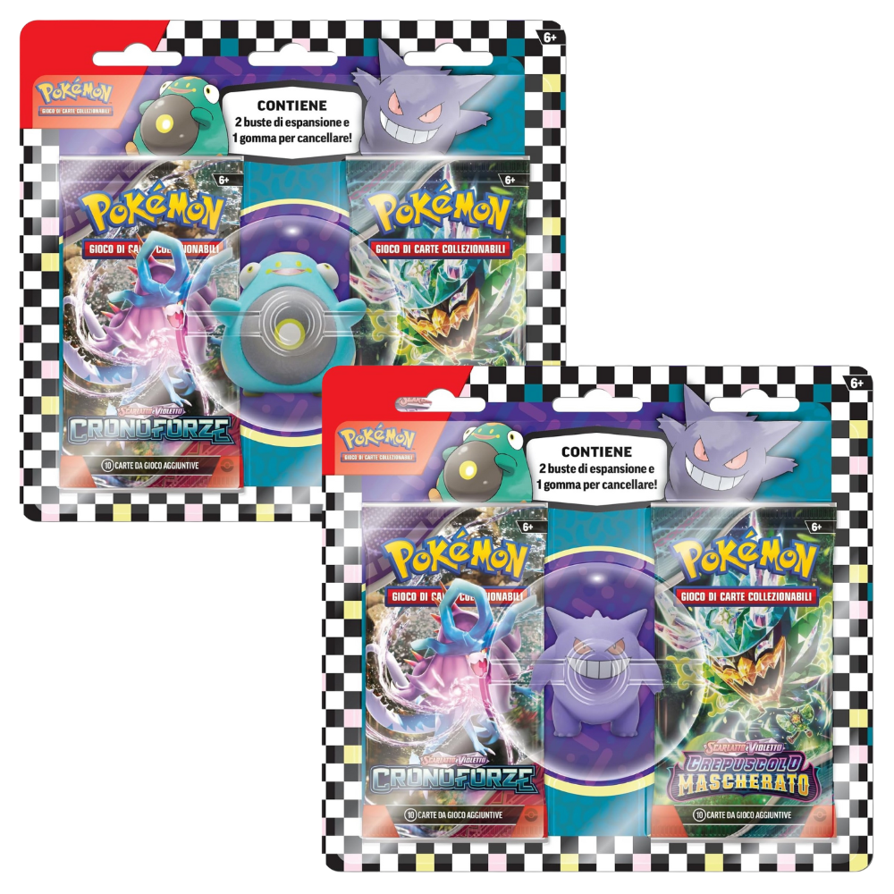 Ogni blister contiene 2 buste d'espansione + 1 gommina collezionabile raffigurante un Pokémon.