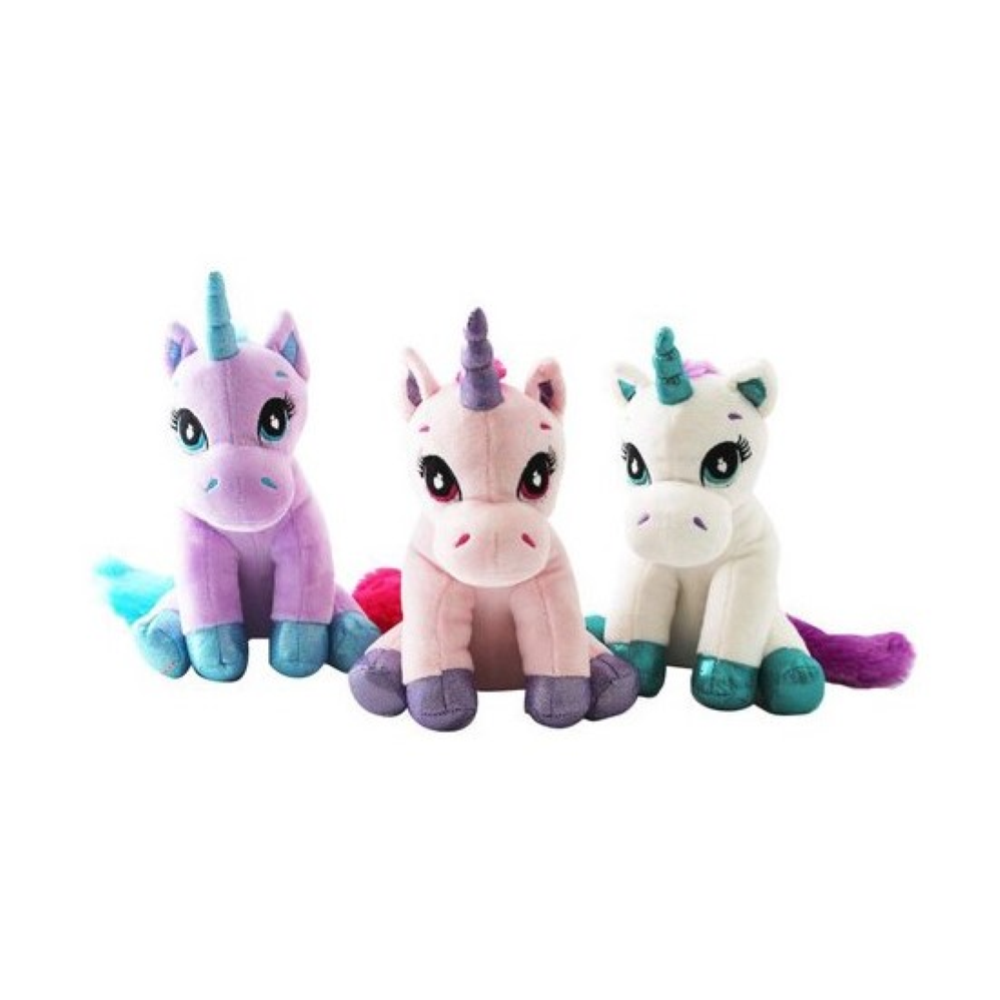 Unicorno peluche con corno e zoccoli glitterati.