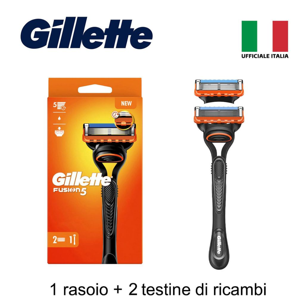 Gillette Fusion5 Rasoio da Uomo, 1 Rasoio Gillette, 2 lamette di ricambio per rasoio, con striscia lubrificante per una rasatura profonda Ottieni una rasatura più profonda e duratura* con il rasoio da uomo Gillette Fusion5. Con manico ergonomico per darti controllo, 5 lame anti frizione per una rasatura profonda e una lama di precisione per i punti più difficili da raggiungere.