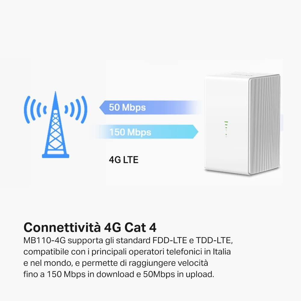 MB110-4G è un Router 4G LTE Cat 4 che supporta gli standard FDD-LTE e TDD-LTE (compatibile con i principali operatori telefonici in Italia e nel mondo) e permette di raggiungere velocità fino a 150 Mbps in download e 50Mbps in upload.