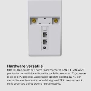 E' dotato di 2 porte Fast Ethernet (1 LAN + 1 LAN-WAN) per fornire connettività a dispositivi cablati come smart TV, console di gioco e PC desktop. La porta per antenna esterna 3G-4G permette di aumentare la ricezione del segnale LTE in aree remote, in cui la copertura dell'operatore risulta instabile.