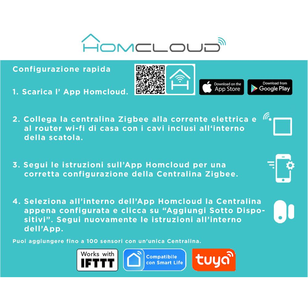La configurazione è semplice e rapida. Scarica e installa l'App Homcloud sullo smartphone e segui le inidicazioni dopo aver pre-configurato la Centralina zigbee Homcloud.