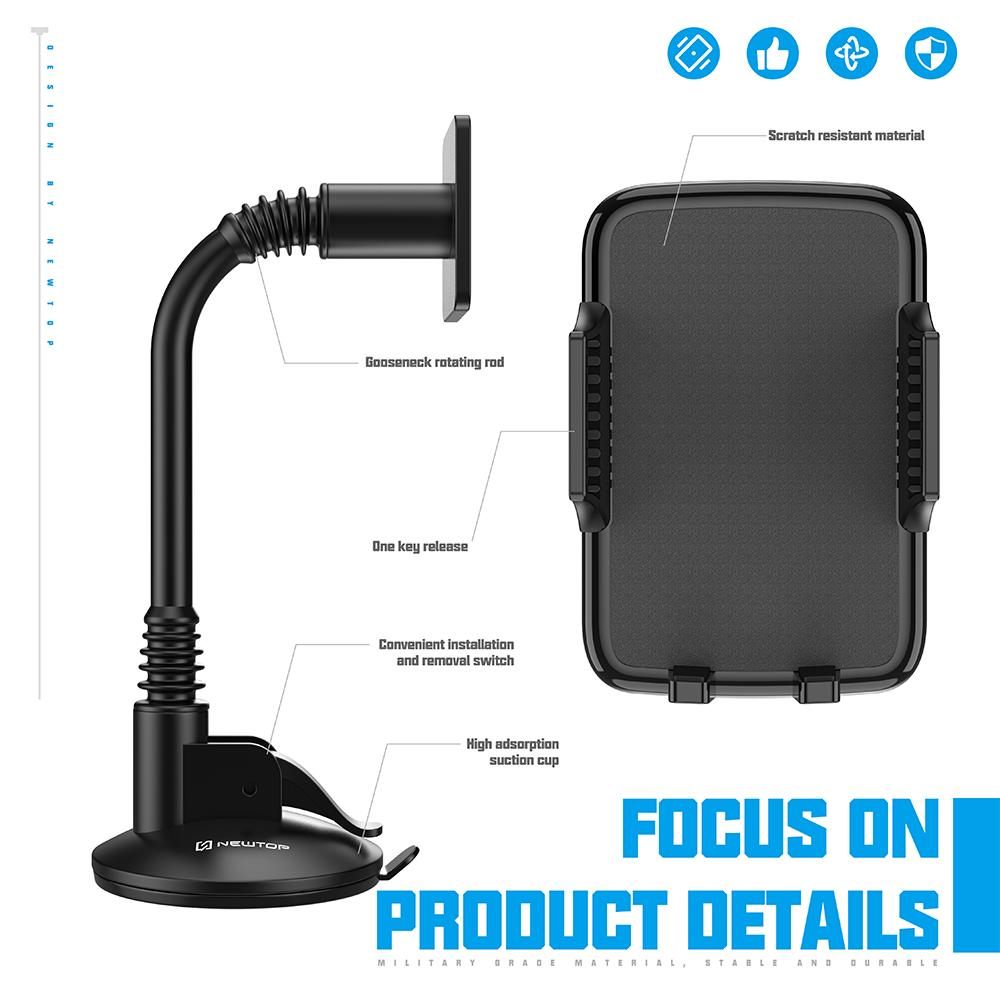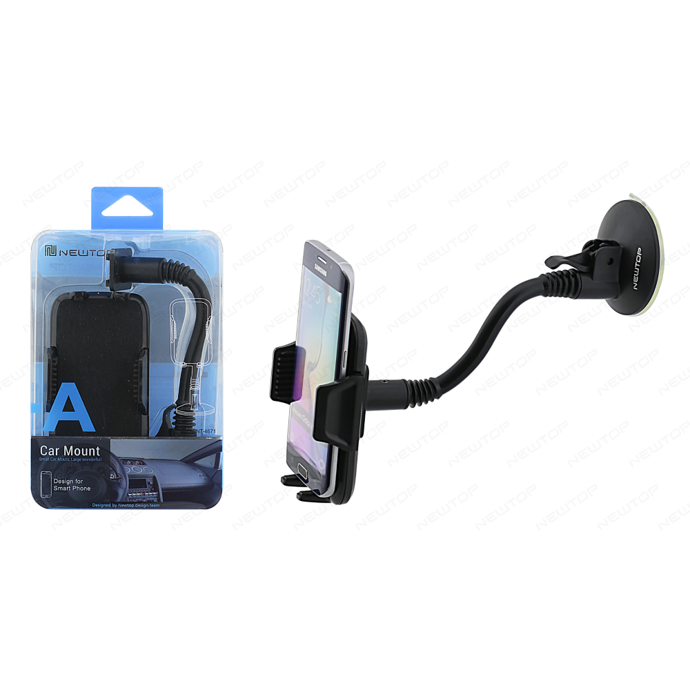 Un ottimo supporto a ventosa con braccio in metallo flessibile per regolare al meglio la posizione che preferite in auto del vostro dispositivo. Grazie all'alloggio con le alette regolabili potete adattare tutti i tipi di smartphone, cellulari, dispositivi GPS e quant'altro grazie alla larghezza massima di espansione di 9 cm e minima di 5,5 cm. Il supporto presenta sulla parte dove poggia il retro del vostro dispositivo un rivestimento morbido in simil velluto e le alette anche hanno dei dentini in gomma per reggerlo ben stabile e non rigarlo. Dietro al supporto abbiamo il pulsante per regolare la larghezza e poi diminuirla manualmente. Sulla parte bassa dell'alloggiamento troviamo due dentini di appoggio anch'essi rivestiti con della morbida gomma. La ventosa dal diametro di ben 7 centimetri e grazie al pulsante per il fissaggio, permette un'ottima presa sul vetro. Rimuovete la pellicola protettiva della ventosa prima dell'installazione. Il braccio flessibile e ruotante è lungo 20 cm. I materiali utilizzati sono plastica per il supporto, metallo per il braccio flessibile, gomma le parti dove tocca lo smartphone per la presa, e simil velluto dove poggia il retro.