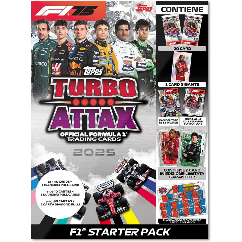 Turbo Attax 2025 include anche il ritorno delle categorie più amate come Podium Power, 100 Club, F1 Super Novas, Stars of Tomorrow, Epic Moments e la più grande collezione di Legends di sempre, con 18 carte Icons of the Grid da collezionare.