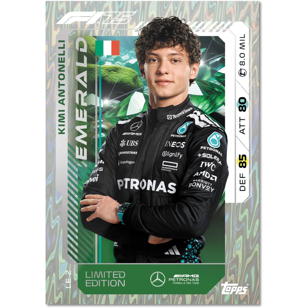 Questo Starter Pack esclusivo online contiene 40 carte Turbo Attax, inclusa una Emerald LE di Andrea Kimi Antonelli, una Ruby LE di Lewis Hamilton e una carta Diamond Pull garantita.