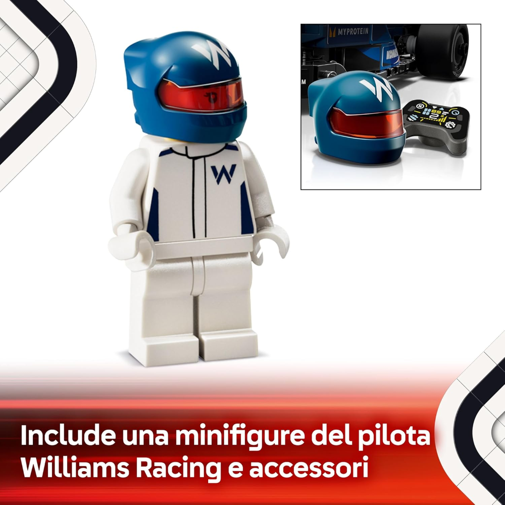 Comprende 1 minifigure LEGO da collezione: il set include una minifigure del pilota con tuta Williams Racing e casco, posizionabile all'interno dell'auto da corsa per ricreare emozionanti gare