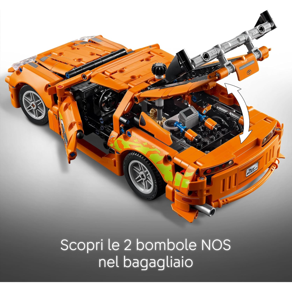 Macchina giocattolo Toyota Supra: questa auto sportiva è ricca riferimenti divertenti per deliziare i fan della serie Fast and Furious, comprese le 2 bombole di NOS presenti nel bagagliaio del veicolo LEGO